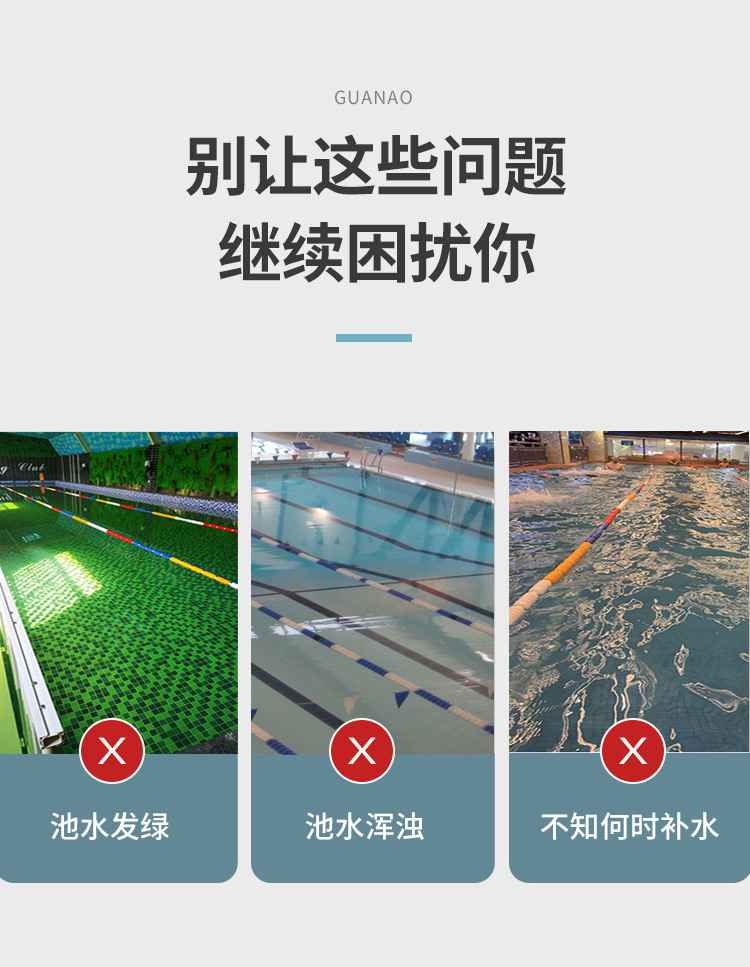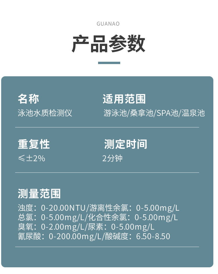 4、檢測精準(zhǔn),項(xiàng)目齊全。貫奧泳池水質(zhì)監(jiān)測儀器設(shè)備可檢測12個(gè)常規(guī)項(xiàng)目,參數(shù)可自由定制。